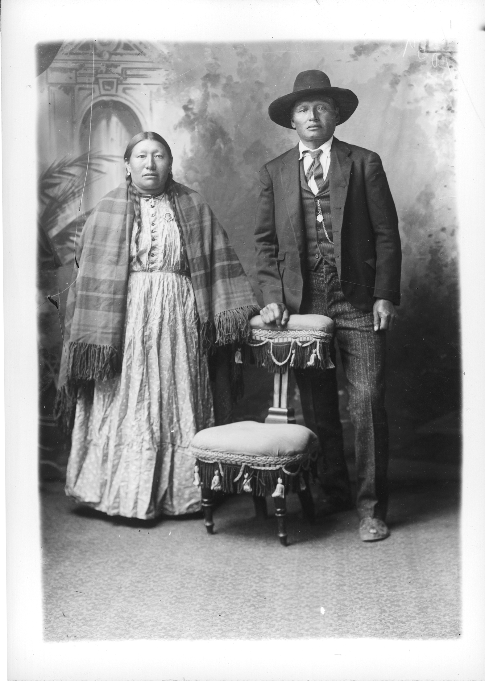 Summary: Mr. and Mrs. Flying By stand posed for a portrait. She wears a polka dotted dress and a plaid shawl. A round pin is visible on her dress. He wears a dark suit, hat, and tie. A watch chain is visible on his vest. A chair is visible in the foreground