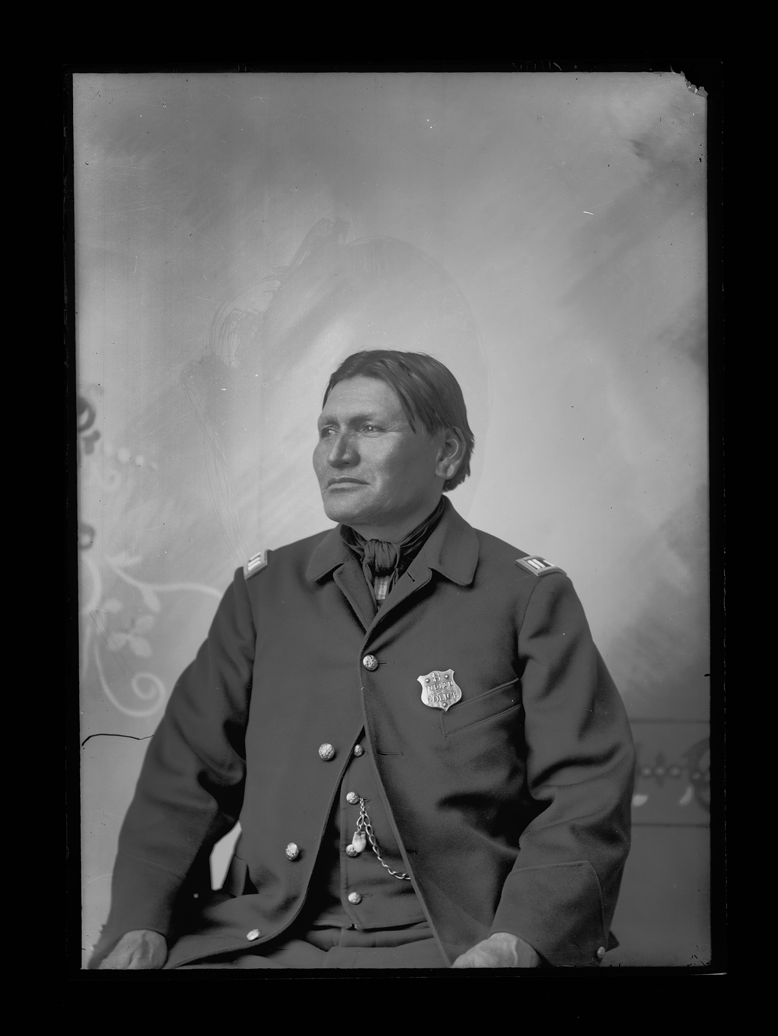 Summary: Standing Soldier, an Indian policeman, sits posed for a portrait. He is wearing his uniform, complete with epaulettes and badge.
