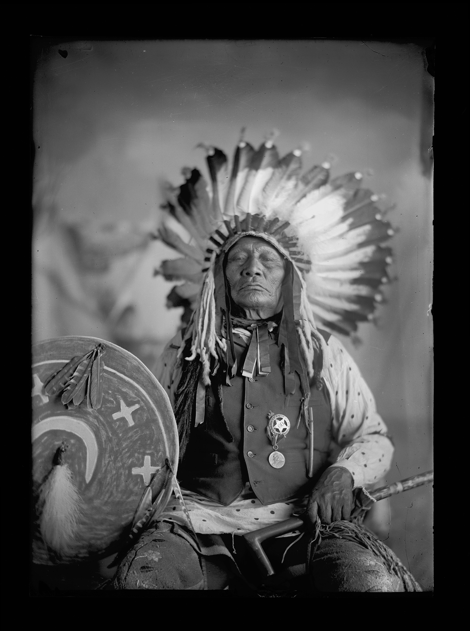 Summary: Chasing Bear sits posed for a portrait. He wears an elaborate feather headdress, and holds a shield in one hand, and a pipe in the other. He has what appears to be a sheriff's badge pinned to his vest. He sits in front of a backdrop with tipis on it.