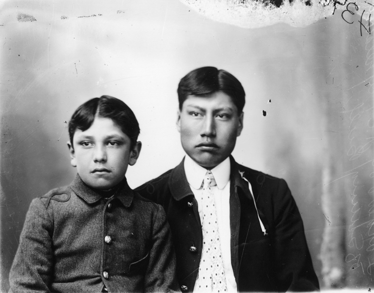 Summary: Studio portrait. The younger boy wears what could be a school uniform, and the older boy wears a suit and tie