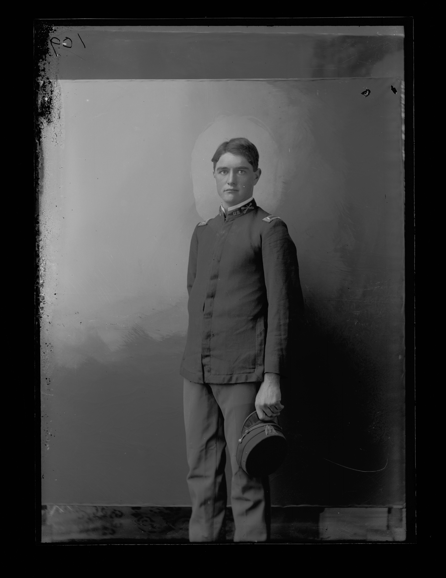 Summary: An unidentified soldier stands for a portrait in his military uniform. He holds his cap in his hand
