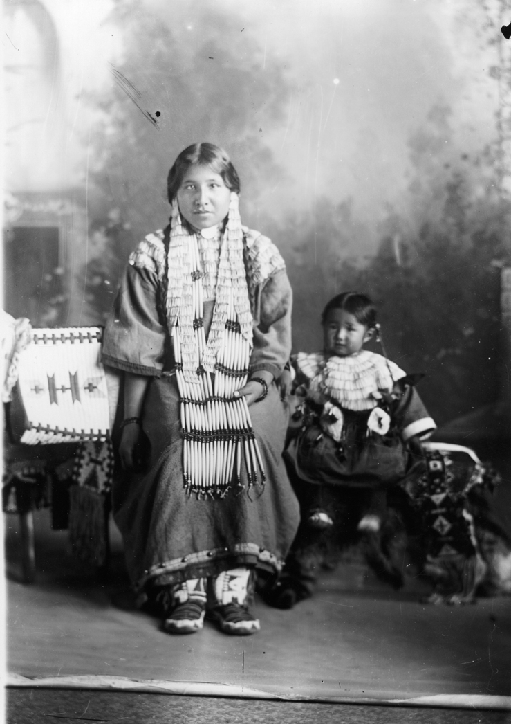 Summary: Maggie Standing Soldier and her niece Josephine Dunn sit posed for a portrait. Both wear elaborate dresses with dentilium shell yokes, jewelry, and moccasins. Other examples of beaded items are also visible in the photograph