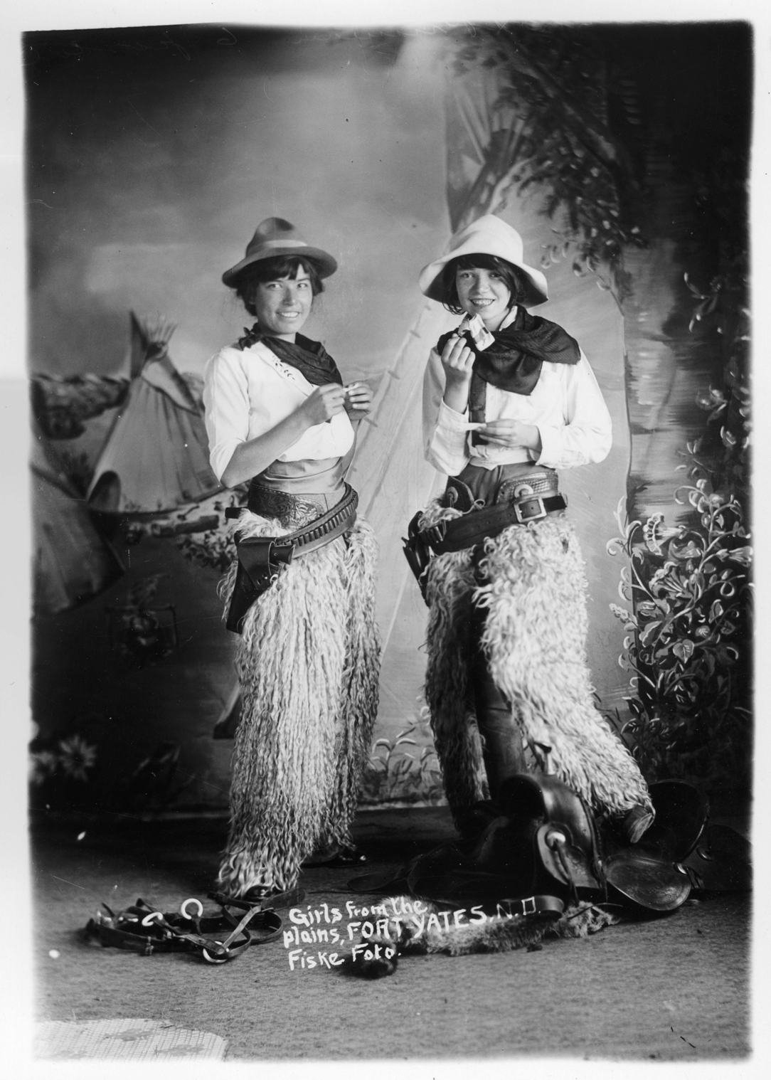Summary: Full length standing portrait of Margaret Primeau and Genevieve Forte Froelich dressed as cowgirls for this studio portrait. They wear neckerchiefs, hats, chaps and gun belts. Saddles and other equipment is on the floor and a painted backdrop is behind them. Both are rolling cigarettes. Frank Fiske dressed and posed them to represent them as "Girls from the Plains."