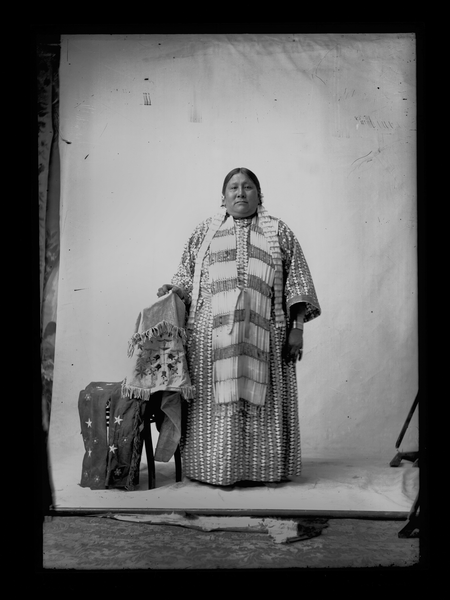 Summary: Mrs. Standing Soldier stands posed for a portrait. She wears an elaborate dress and hair ties. Two examples of fine needlework are displayed to her right.
