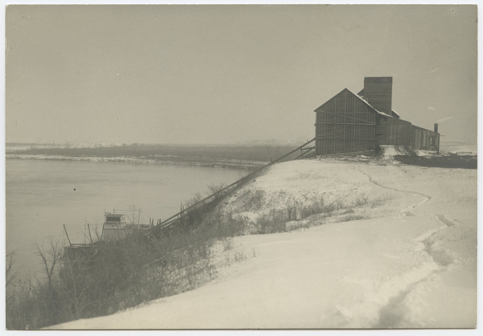 Title: River boat tied up to grain elevator 3 miles N of Fort Yates (N.D.)