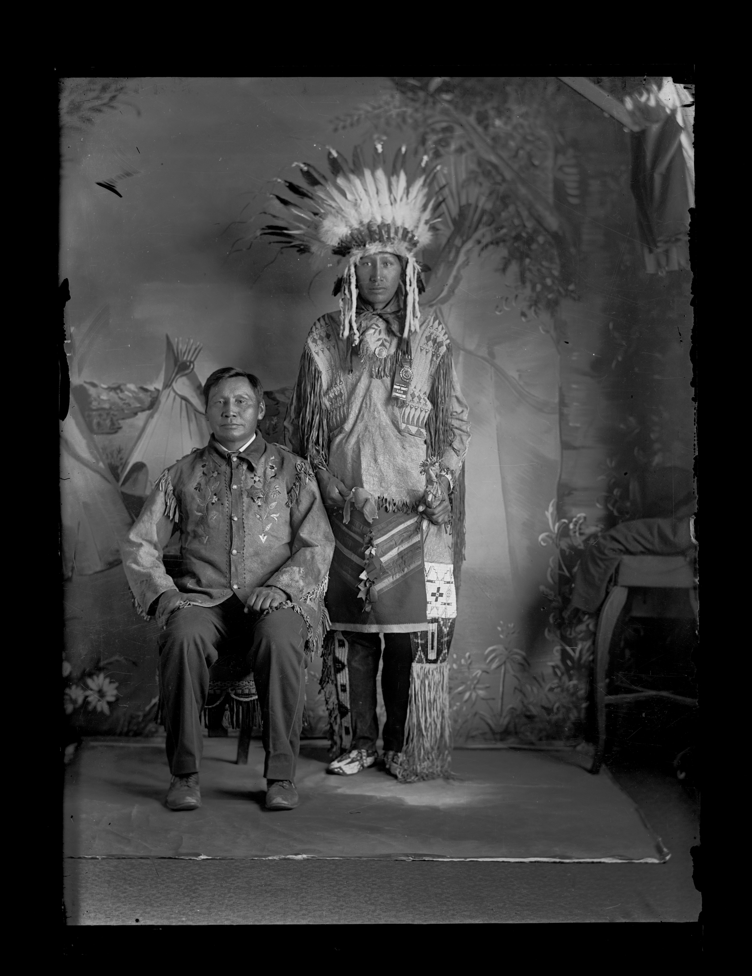 Summary: Tom Frosted and his son Philip pose for a portrait. Tom Frosted sits in a chair and wears a quilled buckskin shirt, and police badge, while Philip stands behind him, wearing a headdress, a beaded fringed shirt, and a ribbon from a North Dakota fair. A backdrop painted with tipis hangs behind them.