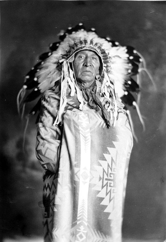 Summary: Martin Iron Bull stands posed for a portrait. He wears a feather headdress, a neckerchief around his neck, and is wrapped in a patterned blanket