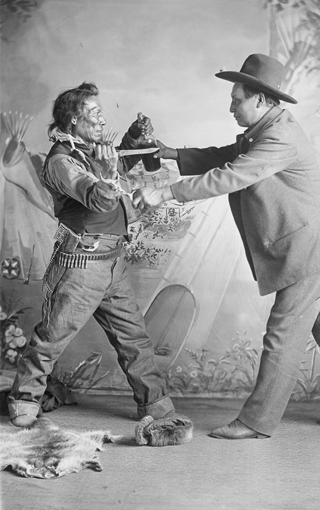 Summary: Sharp Horn Bull and Tom Frosted play out an arrest scene. Tom Frosted wears the uniform of an Indian policeman, and has placed handcuffs on one of Sharp Horn Bull's wrists. Sharp Horn Bull lunges toward Frosted with a knife in one hand, and a bottle filled with a dark liquid in the other.