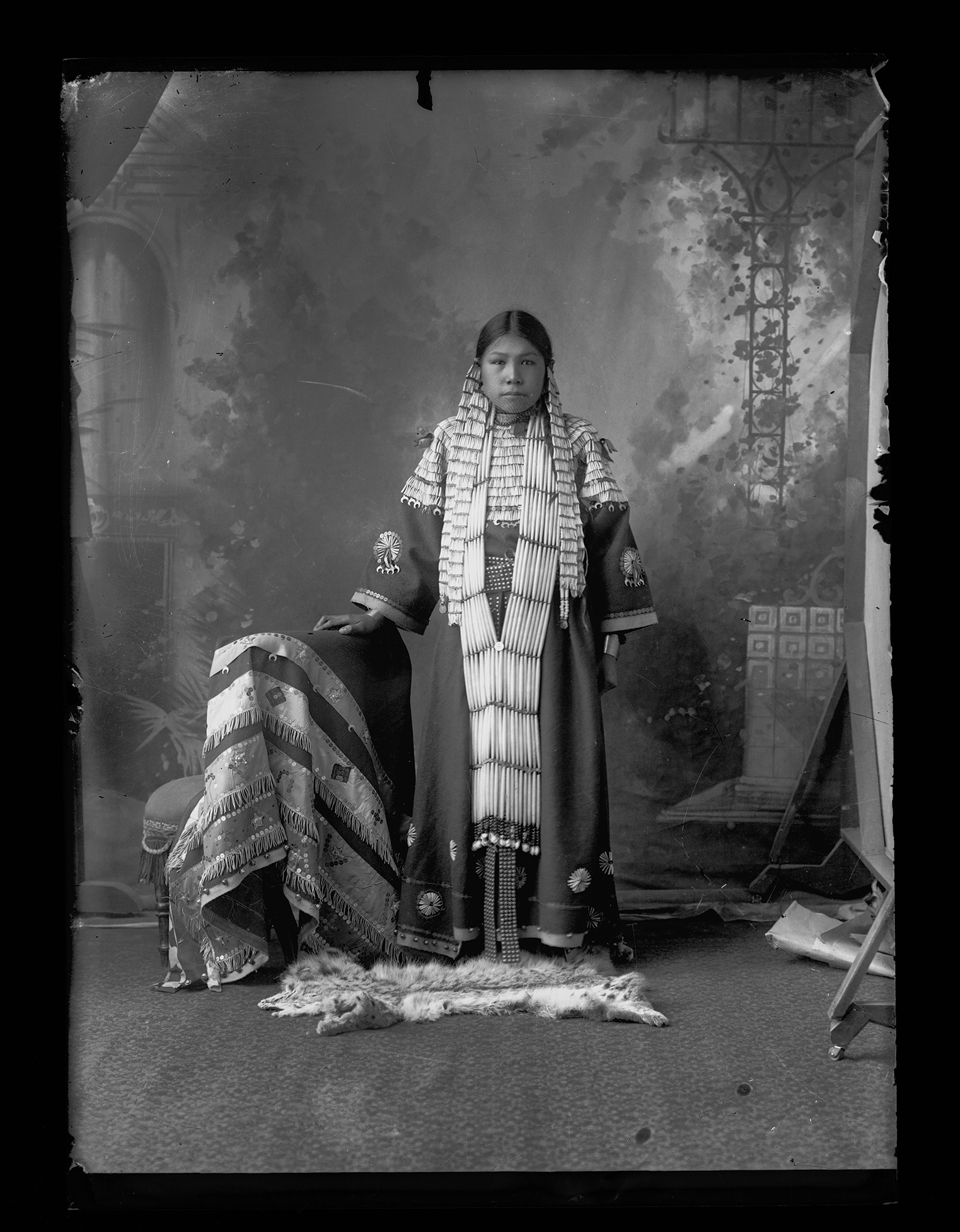 Summary: Nellie Gray Hawk stands posed for a portrait. She is wearing an embroidered dress and a long necklace and hair ties. An embroidered blanket is draped over a box to here right, and an animal pelt is on the ground in front of her.