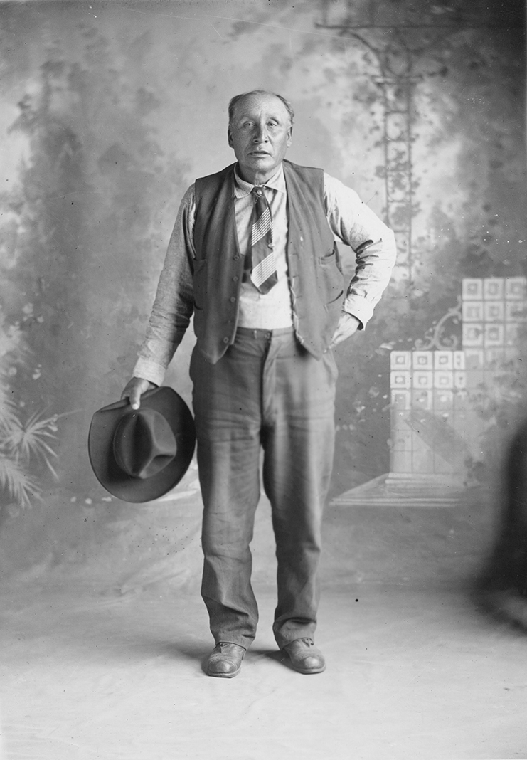 Summary: Nick Cadotte stands posed for a portrait. He holds his hat in his hand. He wears an unbuttoned vest and tie over a shirt and trousers.