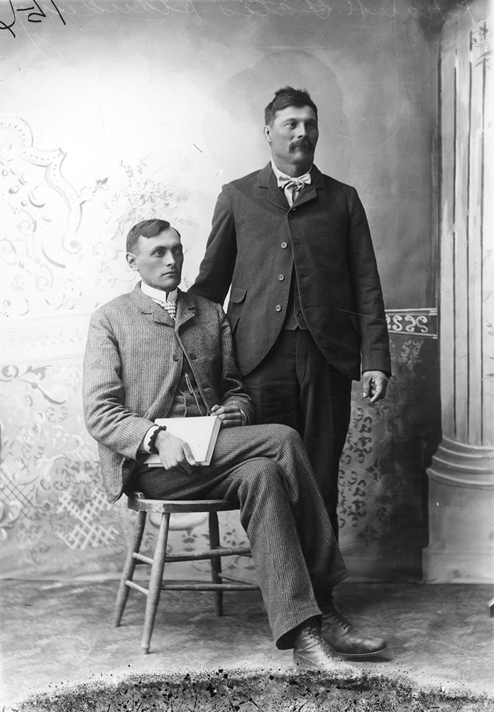 Summary: John Brow and Frank Gates pose for a portrait. Brow is seated, wearing a suit and holding a book. Gates stands next to Brow, and wears a suit