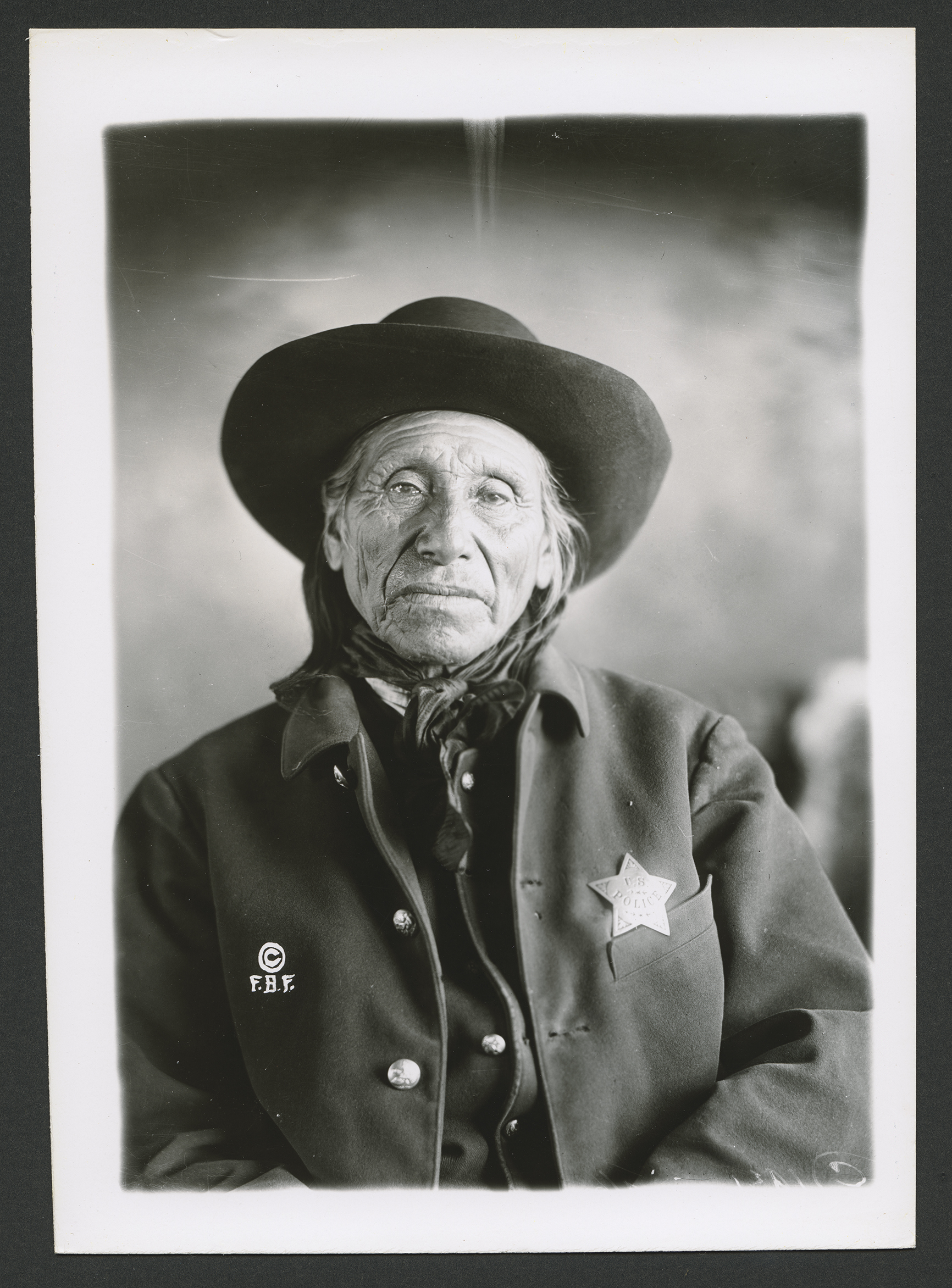 Summary: Half-length, full face, seated portrait of Joseph No Heart wearing heavy coat, hat and Indian police badge that says: "U.S. Police."