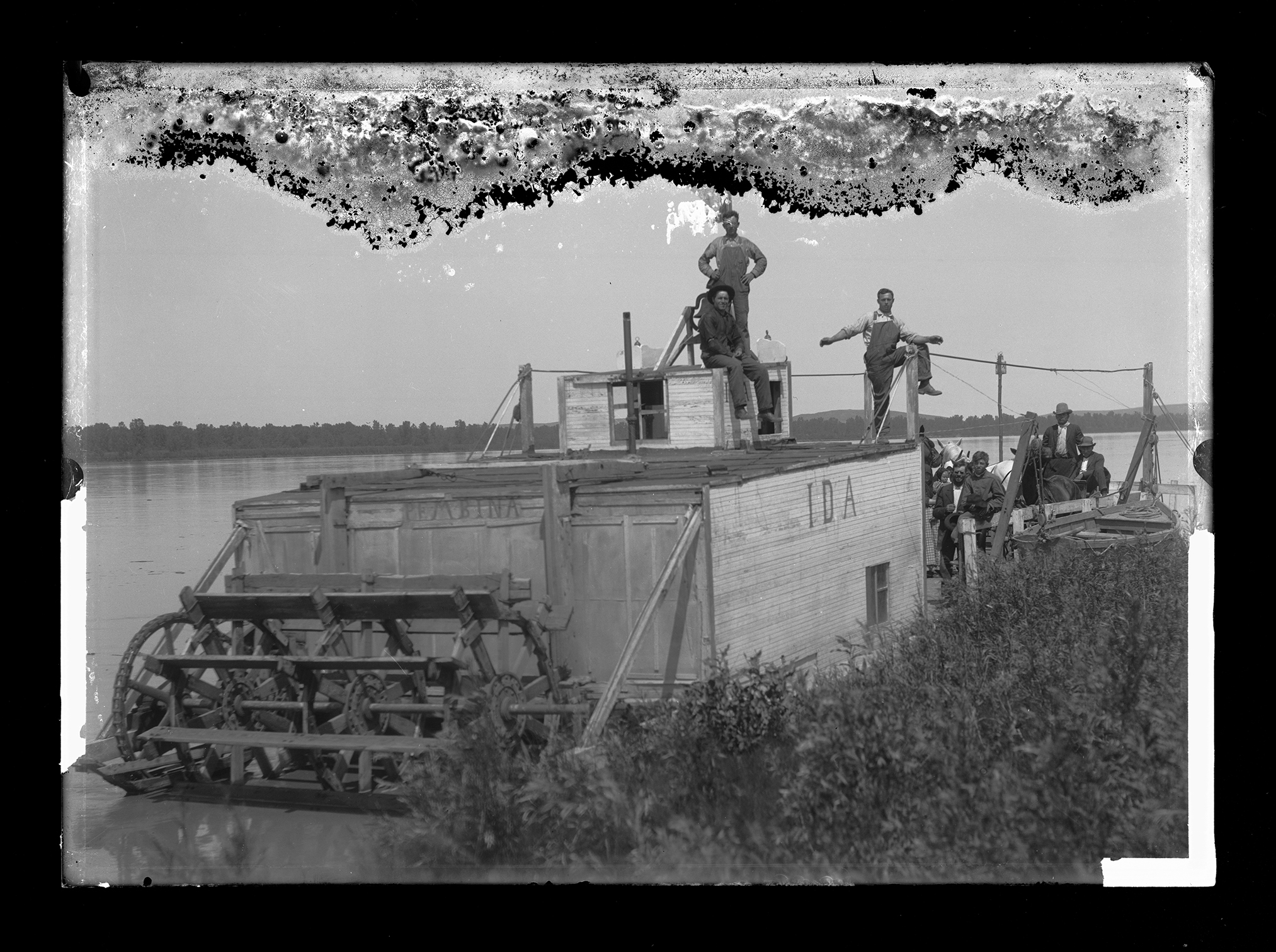 Summary: The Ida is along the shore of the Missouri River. Many people and at least two horses are on board. The stern wheel is visible. A sign reading "Pembina" h angs above the paddlewheel