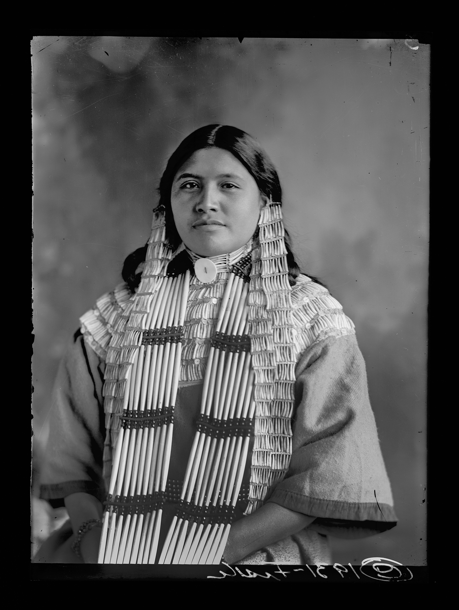 Summary: Portrait, seated. She wears a dark colored dress, elaborate beaded necklace and hair ties. Bracelets are also visible on both wrists