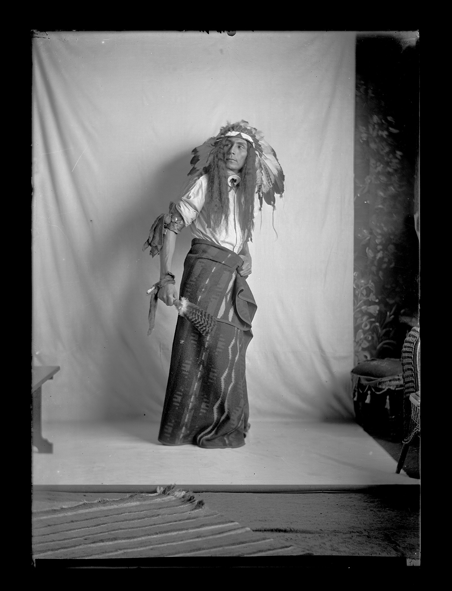 Summary: Francis Zahn stands posed for a photograph against a plain white backdrop. He wears a headdress, armbands, and a necklace in addition to a white button down shirt and a patterned blanket he holds around his waist. He holds a feathered fan in his right hand. A striped blanket lays on the floor in the foreground.