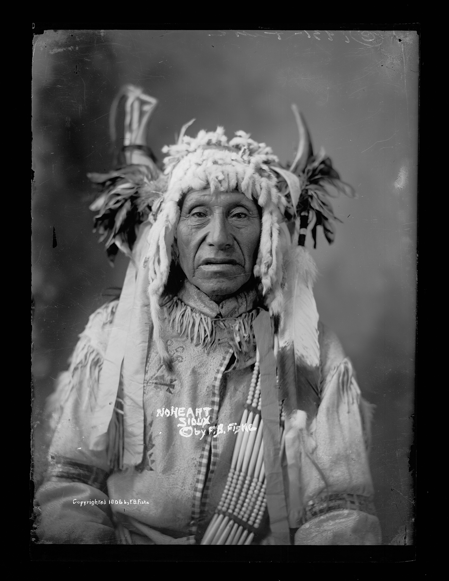 Inscription/Marks: [in red gouache on negative emulsion] No Heart, Sioux @by F. B. Fiske Copyrighted 1906 by F. B. Fiske [Negative envelope] Medicine man, Indian policeman, makes drums. Not war bonnet [facsimile file] 3134 Joe No Heart