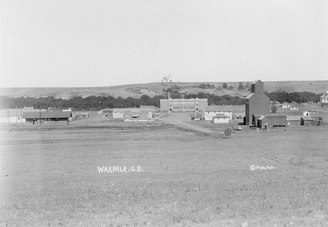 Summary: This view of Wakpala, S.D. shows the Wakpala State Bank, the railroad depot, a school a grain elevator, a church, railroad tracks, and several other buildings.