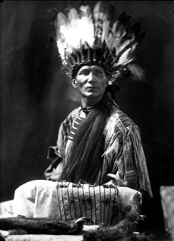 Summary: Full length seated studio portrait of Dr. Charles Eastman in quilled and fringed tunic with war bonnet. His long hair is brushed over his left shoulder in front. And a pile of skins is arranged in the front with a dark plain background.