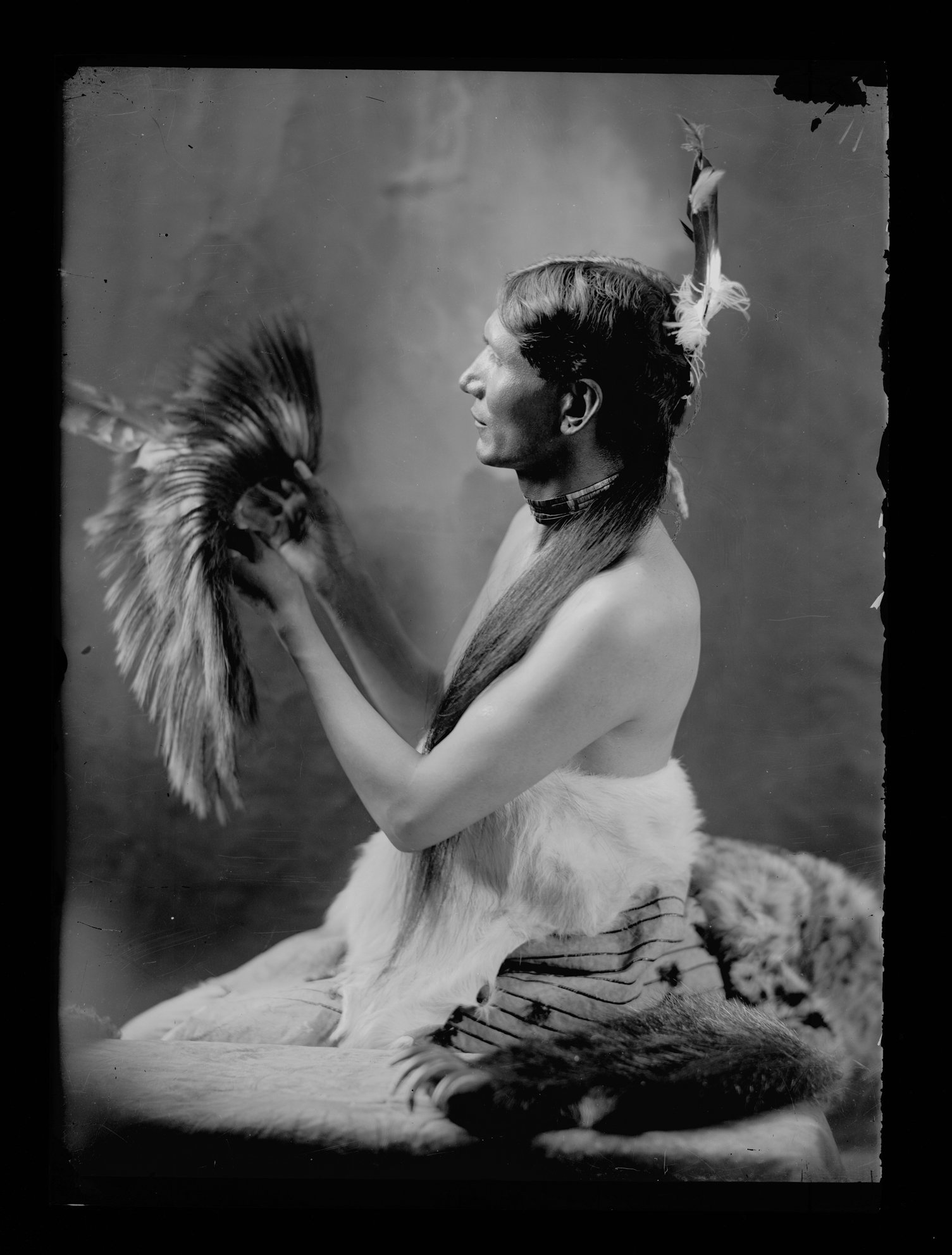 Summary: Full length seated studio portrait of Dr. Charles Eastman. His long hair is brushed over his left shoulder in front with two eagle feathers in the back of his head and he is looking at a headress. His waist is wrapped with a fur and a blanket.