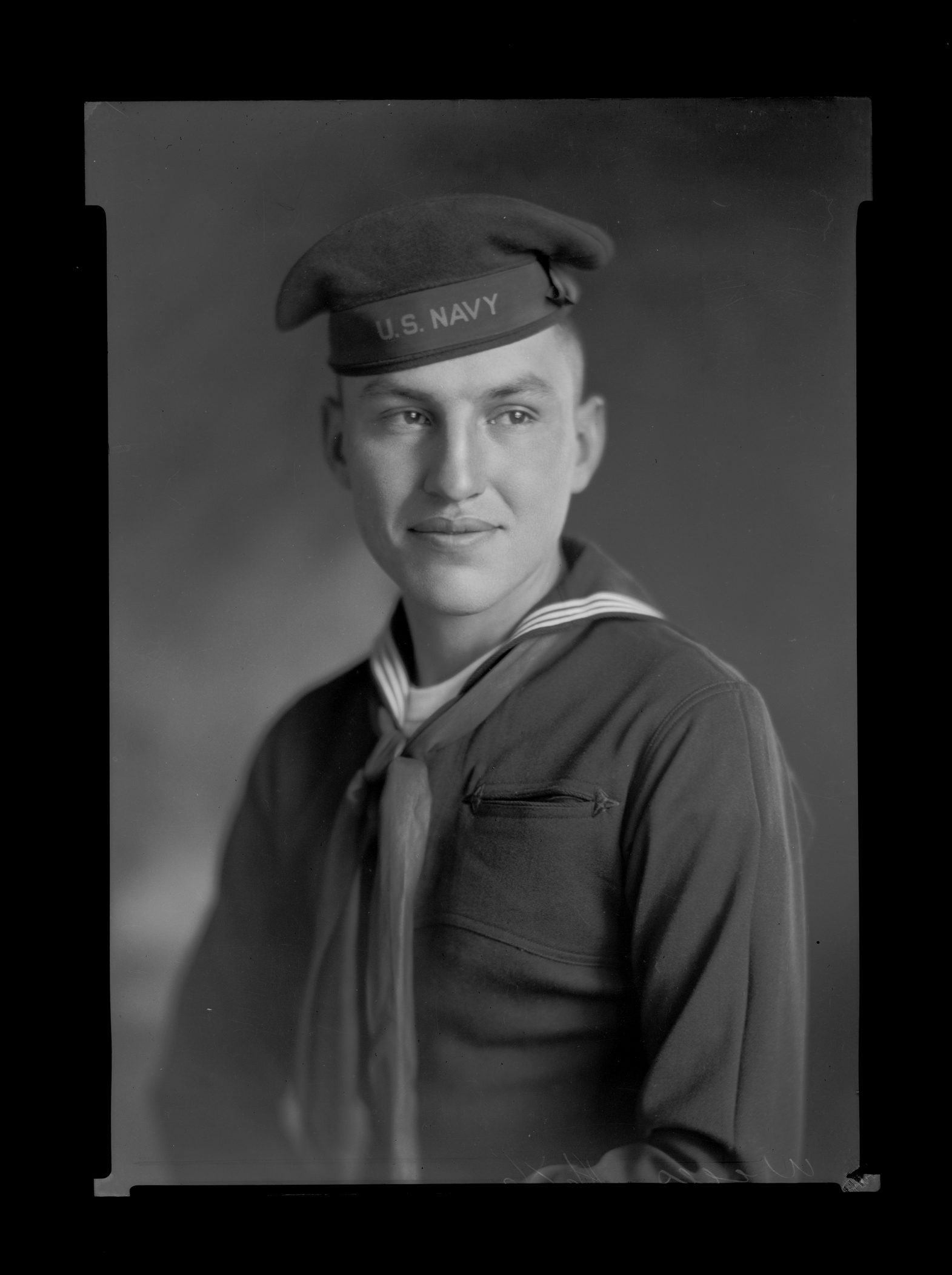 Summary: Ferdinand Wells sits posed for a photograph in his U.S. Navy uniform. "Son of Mollie Red Fox and ___Wells