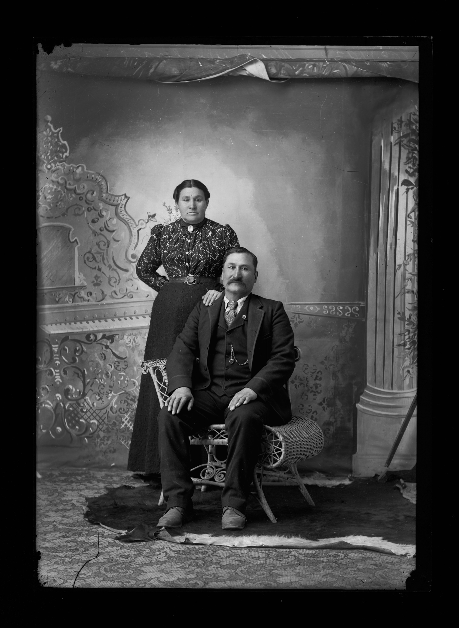 Summary: Mr. and Mrs. Henry Agard are posed for a portrait. Mr. Agard sits in a chair and wears a suit, while Mrs. Agard stands behind him, wearing a blouse and skirt. An animal skin is on the floor