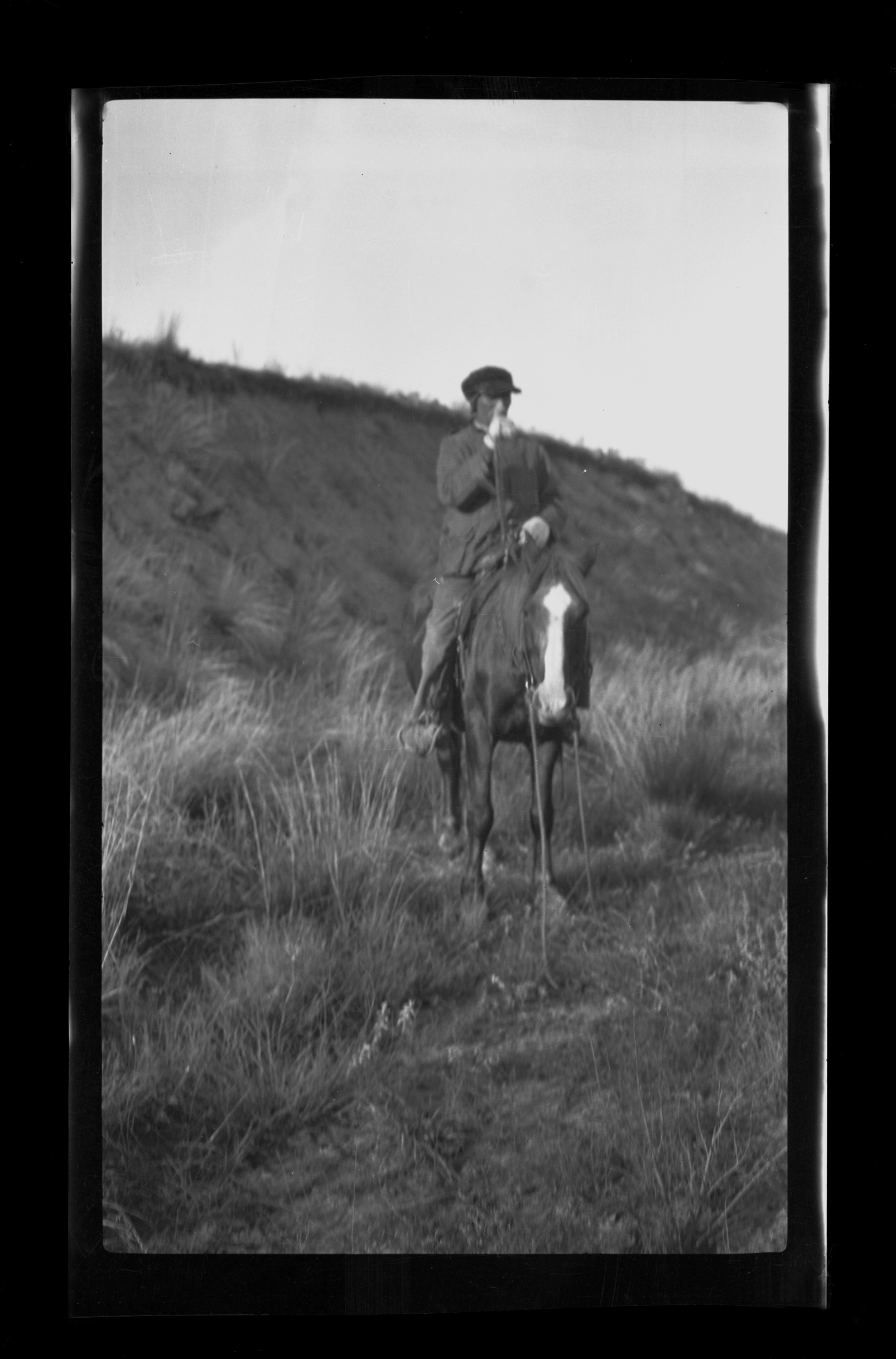 Summary: Frank Gates sits astride a horse in a landscape filled with long grasses