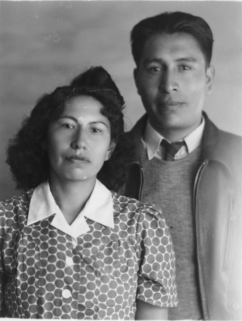 Summary: Mr. and Mrs. Joe Halsey stand posed for a portrait. Mrs. Halsey wears a polka dotted dress with a white collar, and Mr. Halsey wears a zippered jacket, sweater, shirt and tie.