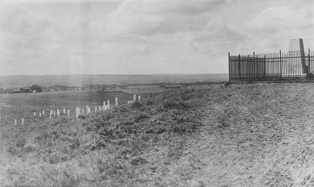Summary: A view of the Custer Battlefield shows a monument behind a wrought iron fence. Headstones, trees, and a building are visible in the distance.