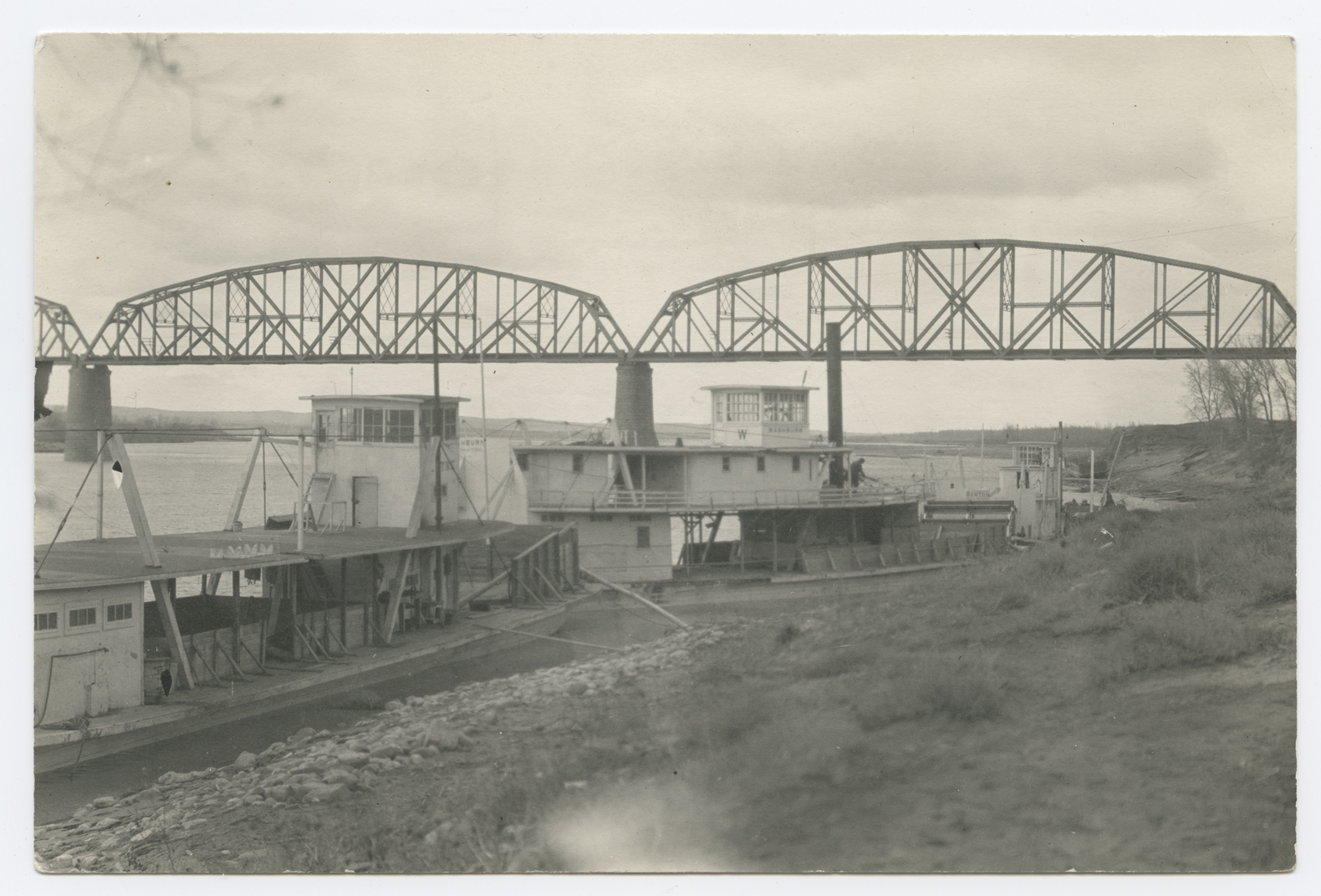 Summary: The steamboats Washburn and Frayne and a third boat are moored at the Bismarck landing. The Northern Pacific Railroad bridge is visible behind them.||The Washburn, a sternwheel packet with a wood hull, was built in Bismarck, N.D., in 1901. Originally owned by William D. Washburn, she became one of Benton Packet Co.'s fleet organized 1904 by Capt. Isaac P. Baker. She was lost in ice at Crockett's Bluff, Ark., on Jan. 12, 1918.The Frayne, built in Washburn in 1908, was a Benton Packet Company boat. I.P. Baker owned the Benton Packet Company, which was headquartered in Bismarck. The Frayne had a wood hull and was propelled by a gasoline motor.