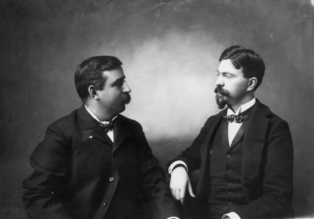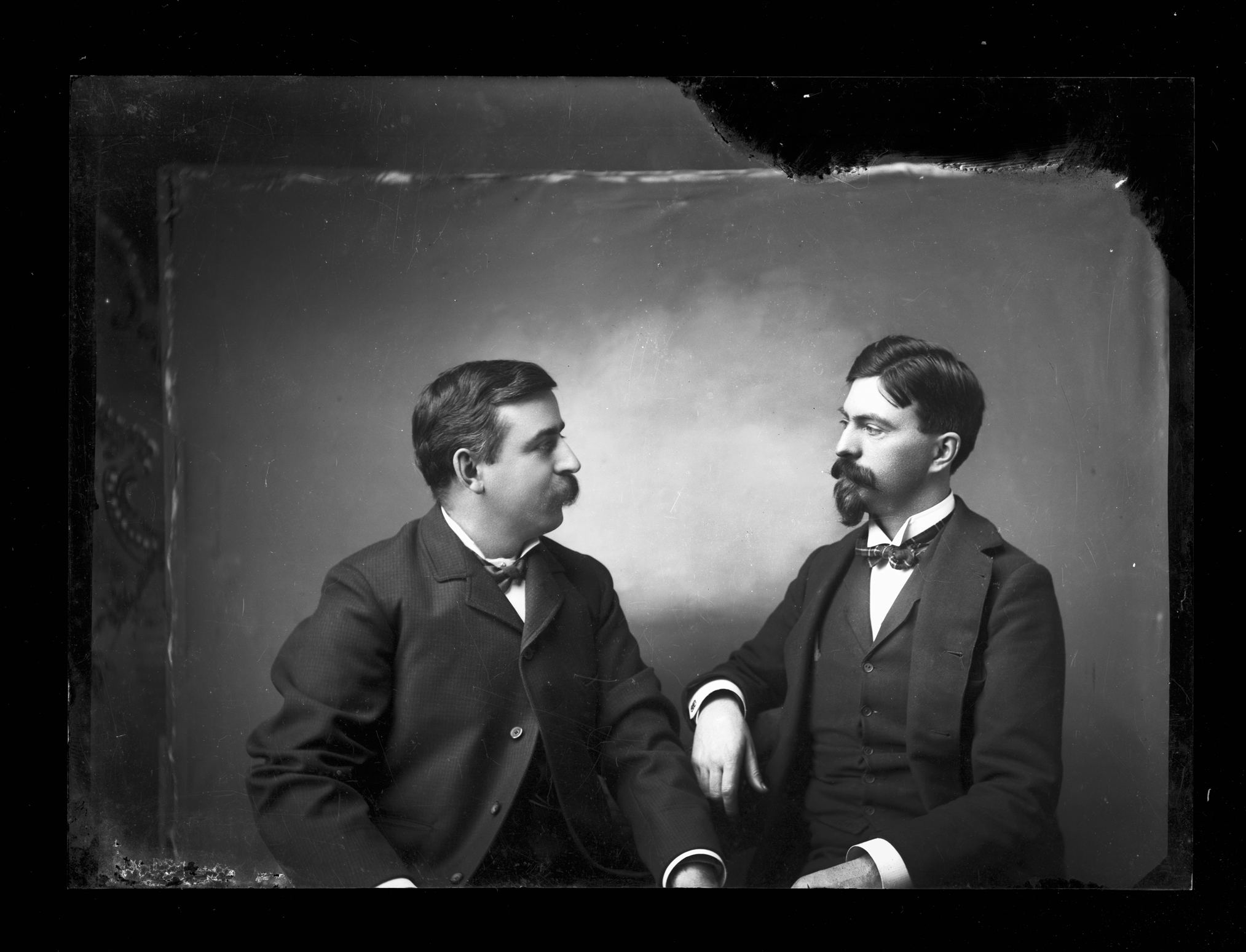 Summary: Half-length, profile seated studio portrait of J. M. Carignan and Major James McLaughlin, Sioux Indian agents. They are wearing dark suits with white tuxedo shirts and dark bow ties. A plain lit background is behind them. [See also 1952-02001] [McLaughlin, James-- 12 Feb 1842- 28 Jul 1923; Carignan, Sr., Jean Baptiste Magloire “John”–18 Sep 1865-08 Jul 1931]
