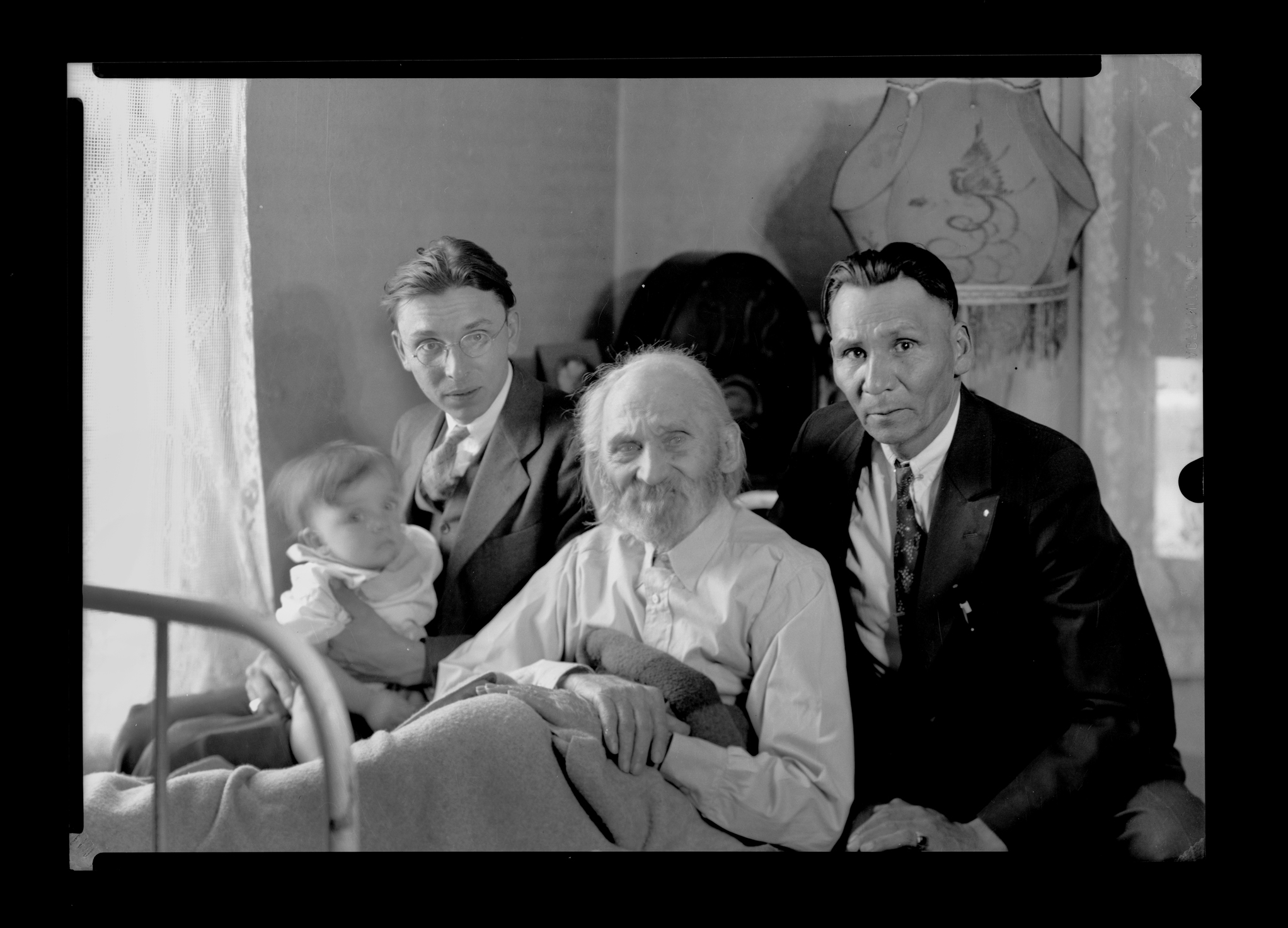 Summary: William Zahn in a buttoned up white shirt sits up in a bed with his legs covered with a sheet and blanket. Around him are his sons and grandsons. From left to right: Billy Zahn, great-grandson, Victor Zahn, grandson who teaches at University of California, Berkeley, William Zahn, grandfather, William Bennett Zahn, grandson.