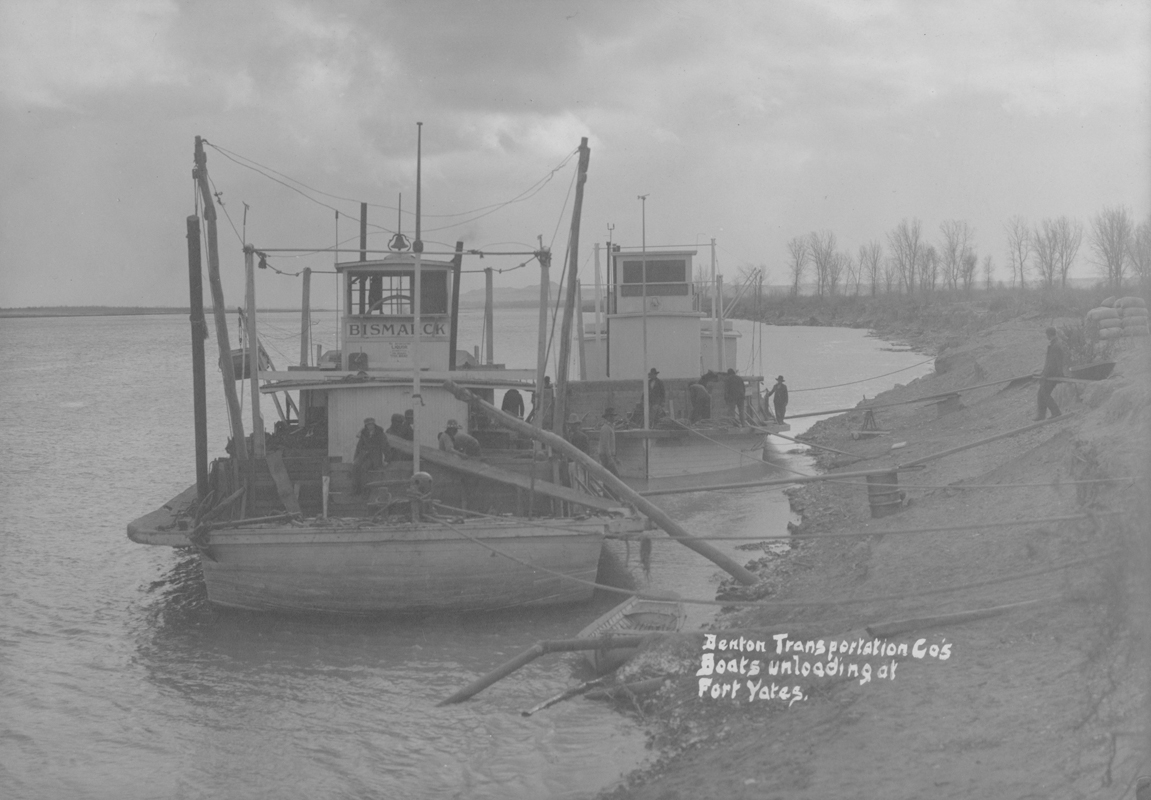 Title: Gas boats Bismarck and Expansion unloading at Fort Yates (N.D.)