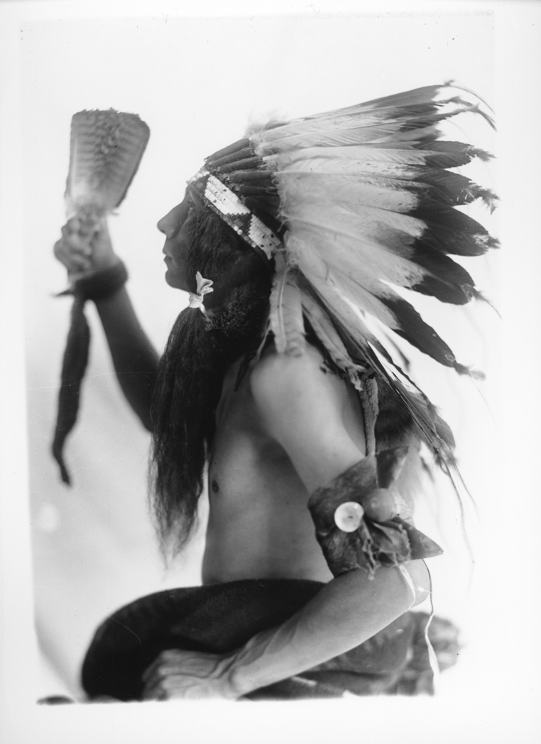 Summary: Francis Zahn sits posed for a photograph. He wears a headdress and armbands, and wears a blanket wrapped around his waist. He holds a feathered fan in his right hand.