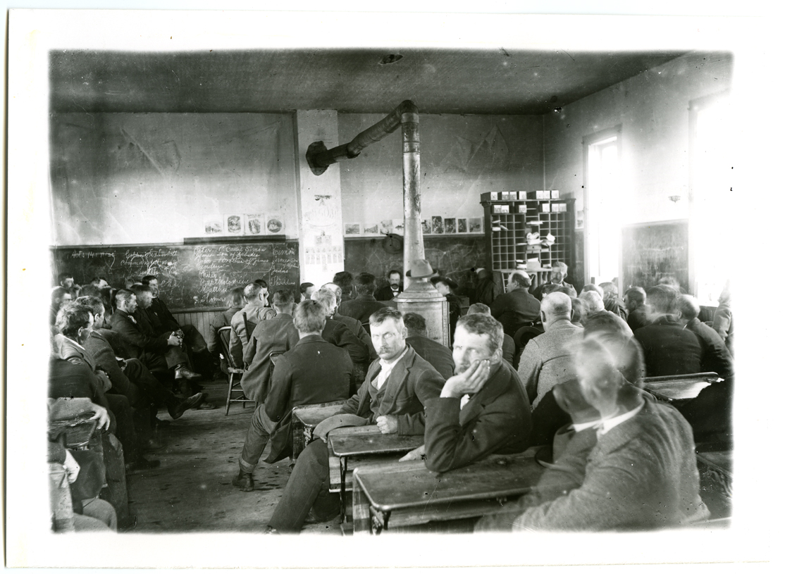 Summary: Men inside what appears to be a classroom, sitting at student desks. Blackboard at front of the room. Wood burning stove in center.