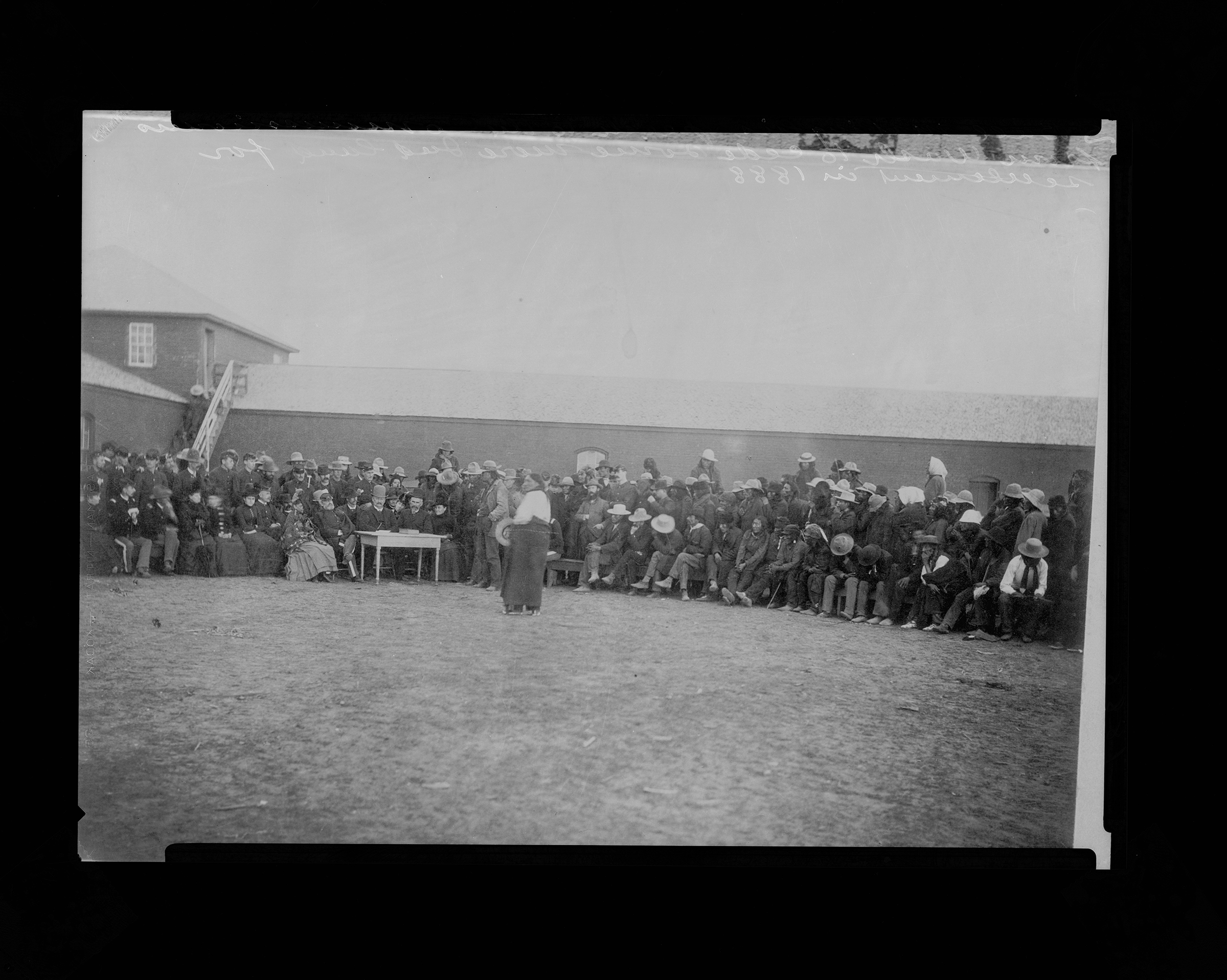 Summary: Sitting Bull's trial at Standing Rock Agency for allegedly instigating the Crow to go to war. Colonel Townsend, 12th Infantry, Colonel Barrister (gray derby hat) and Commissioner James McLaughlin. Photographer: David F. Barry