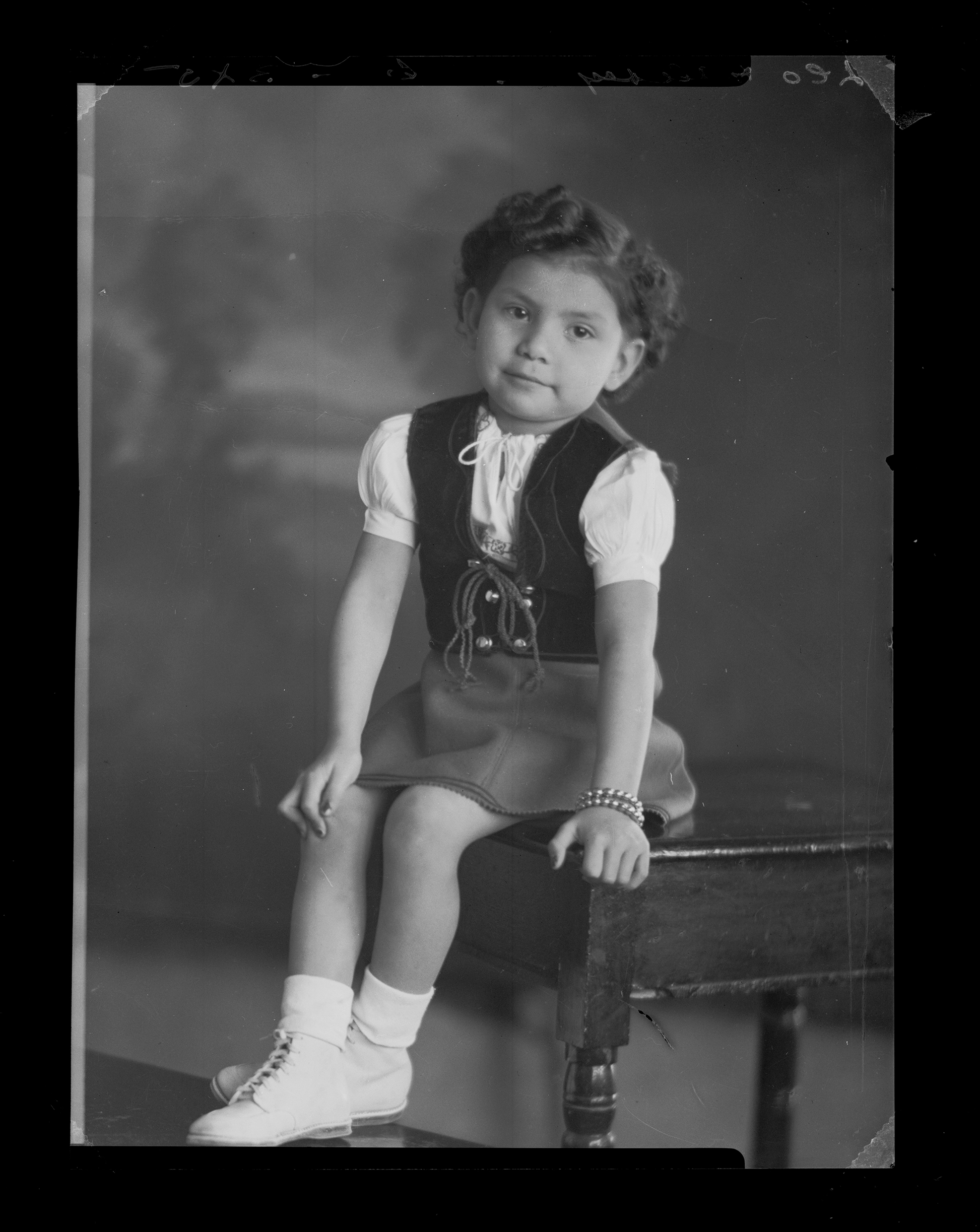 Summary: Leo Halsey's daughter sits posed for a portrait. She wears a dress with a lace-up vest and blouse, She wears a beaded bracelet around one wrist.