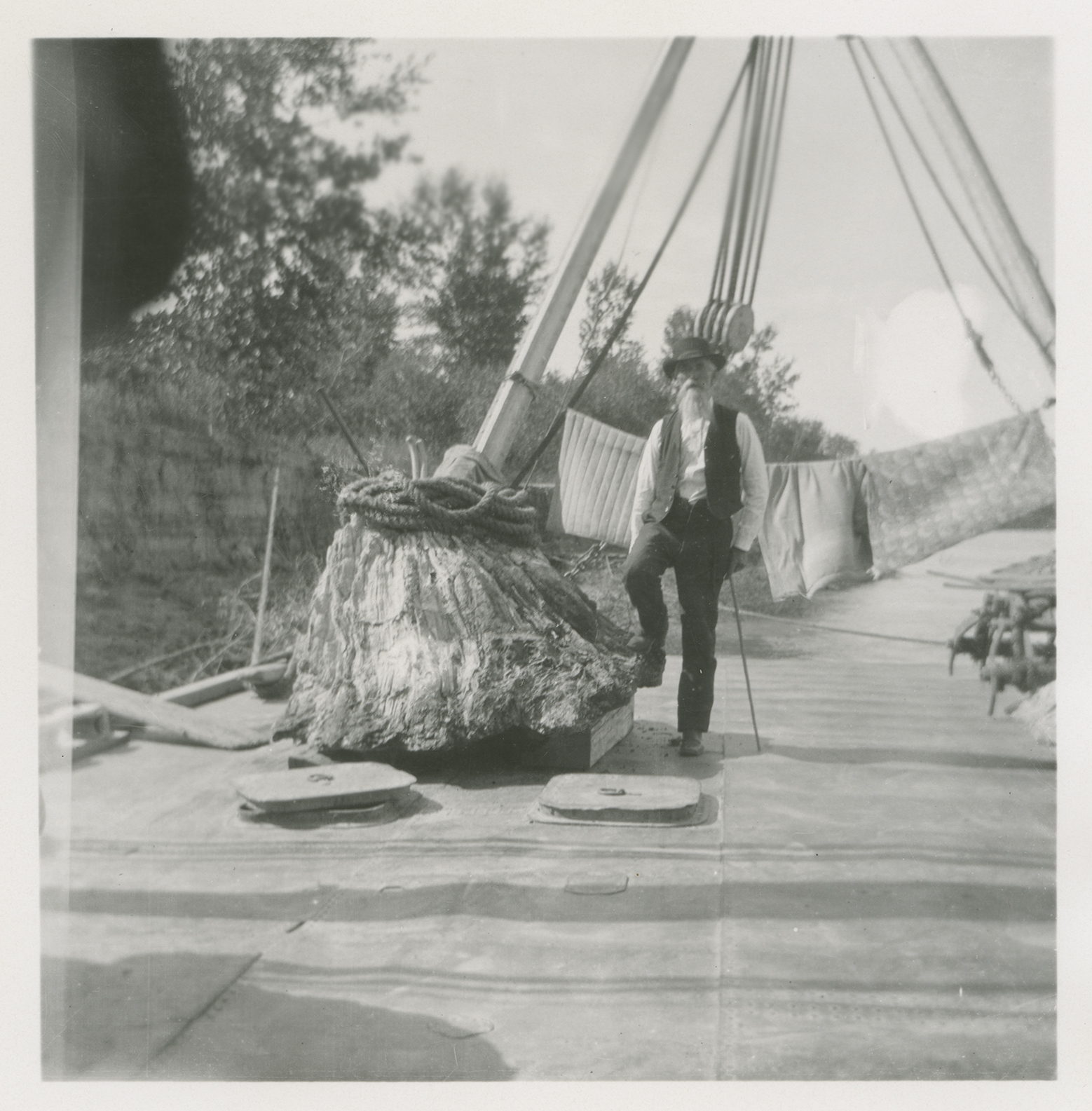 Title: Captain Belk with petrified tree trunk aboard snag boat Mandan