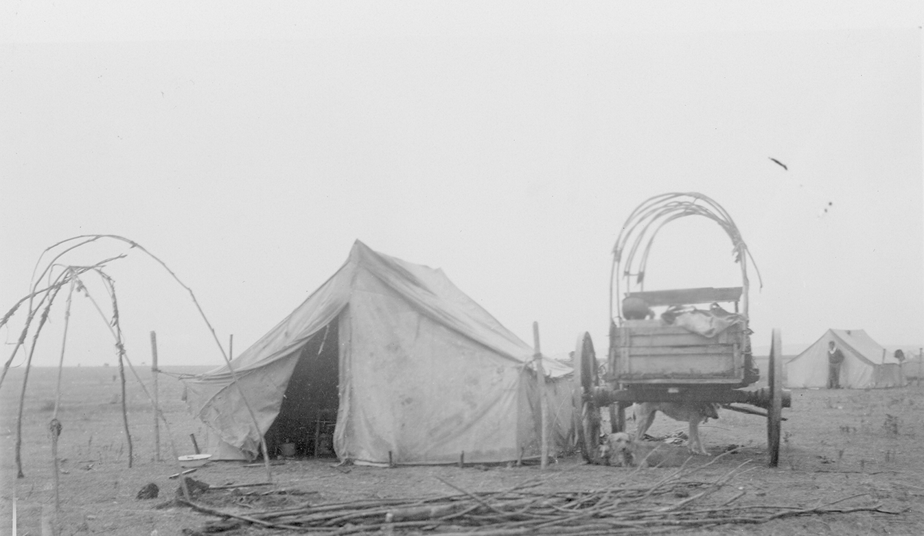 Summary: A wagon sits next to a tent in an open field. The tent flap is open, and the interior of the tent is partially visible. Two dogs sit in the shade under the wagon. Another tent with a person standing in front of it is visible in the distance