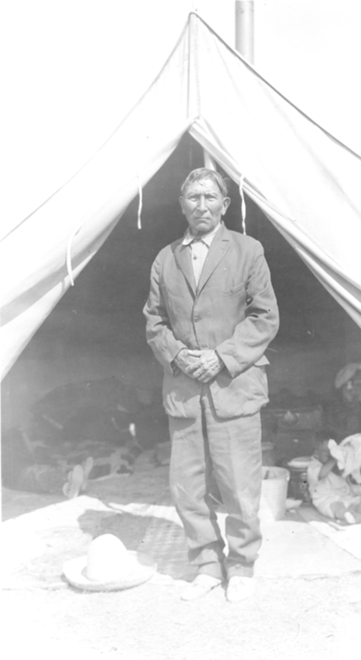 Summary: He stands in front of a tent wearing a suit and beaded moccasins. A baby and a reclining person can be seen inside the tent.