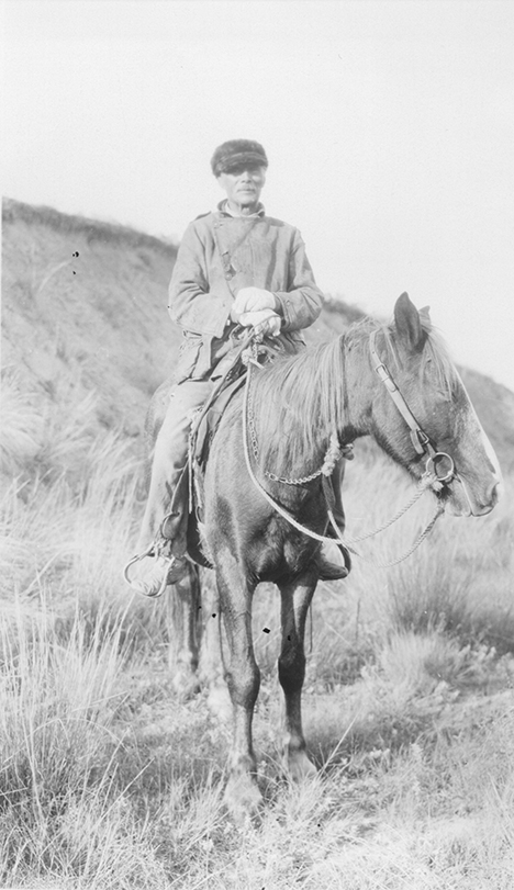 Summary: Frank Gates sits astride a horse in a landscape filled with long grasses.
