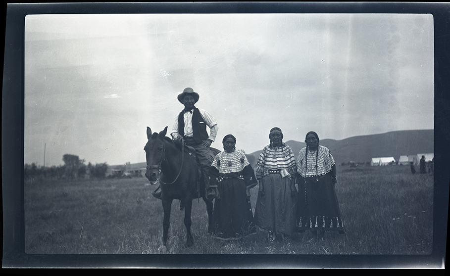 Summary: Ben Loneman sits on horseback, while Mrs. Cecelia Bullhead, Mrs. Frances Archambault, and Mrs. Carolina Redhorse stand next to him. Tents and cars are visible in the background