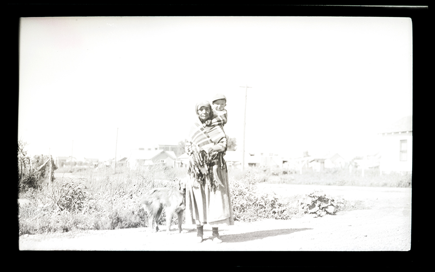 Summary: Mrs. Frances Archambault is standing in the street. She uses her shawl to carry a small child on her back. A dog stands next to them. Buildings and utility poles are visible in the background. The location is likely Fort Yates, N.D.