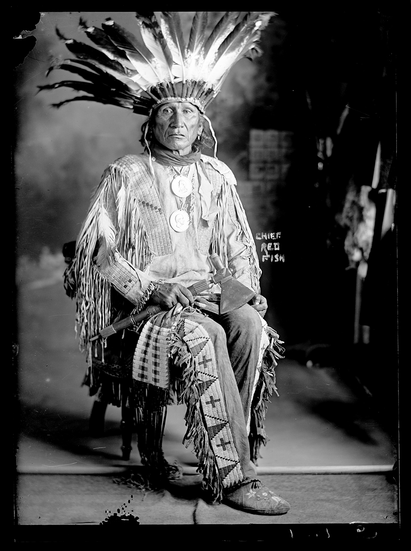Summary: Seated full length portrait in front of painted backdrop. Red Fish is wearing a beaded and fringed jacket and leggings and holding a ceremonial tomahawk and beaded pipe bag in his lap. He has an eagle feather headdress and beaded moccasins. The peace medals he is wearing were identified by SHSND Museum Curator Mark Halvorson: Bust facing left – Zachary Taylor, 1849 medal – 76, 62, & 51 mm sizes – 396 struck, 89 distributed – remainder (307) melted for Fillmore medals Bust facing right – Millard Fillmore, 1850 medal – 76 & 63 mm sizes – 281 struck, 211 distributed – remainder (70) melted for Franklin Pierce medals For additional information on medals: Francis Paul Prucha, SJ, Indian Peace Medals in American History, (Bluffton, SC: Rivilo Books, 1994), 186 pp., illustrated, notes, bibliography, index.
