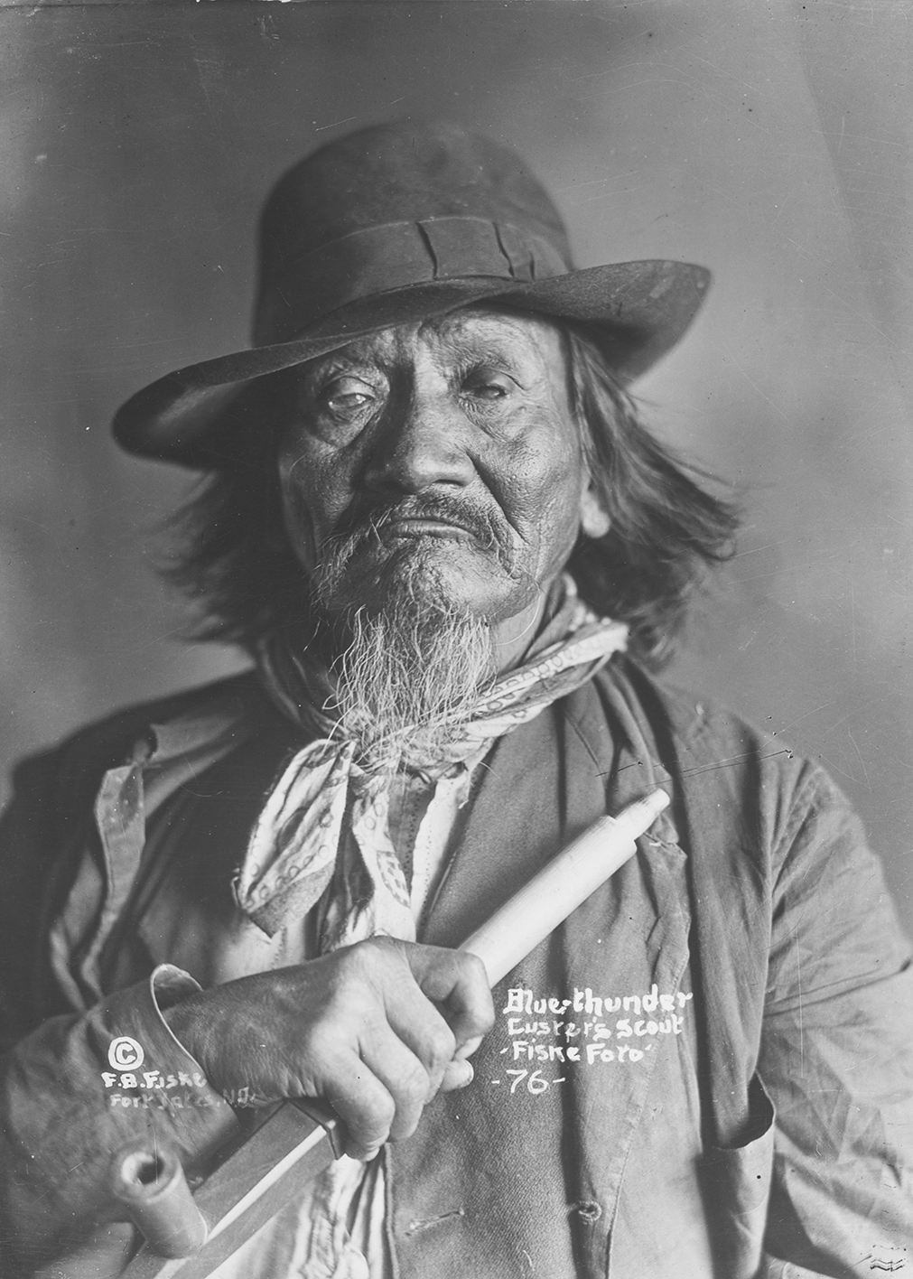 Summary: Blue Thunder sits posed for a portrait. He wears a dark jacket, hat, and neckerchief, and holds a pipe in his hand. "Custer's scout"