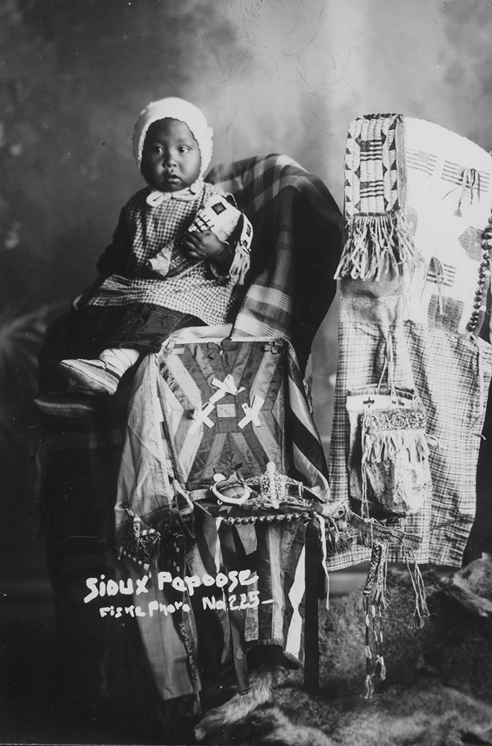Summary: An infant sits on a chair covered with a blanket. A beaded and decorated child carrier is visible next to the child.
