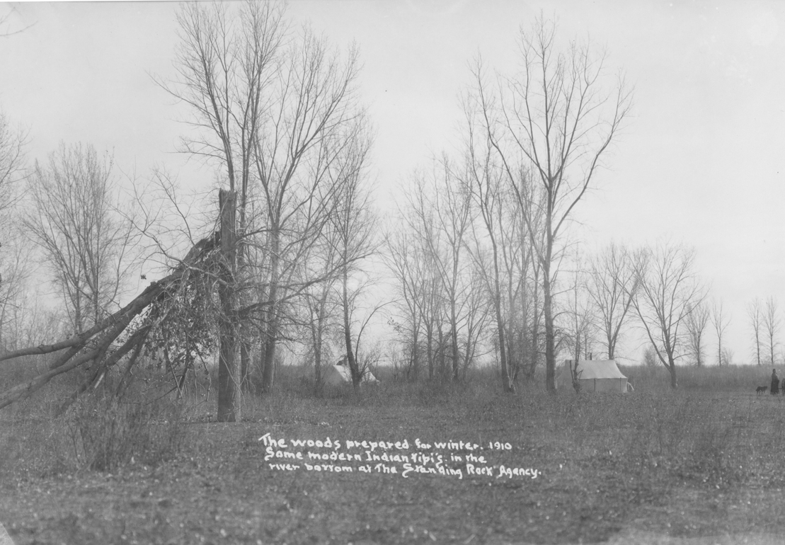 Title: "The woods prepared for winter 1910, Some modern Indian tipis in the river bottom at the Standing Rock Agency"
