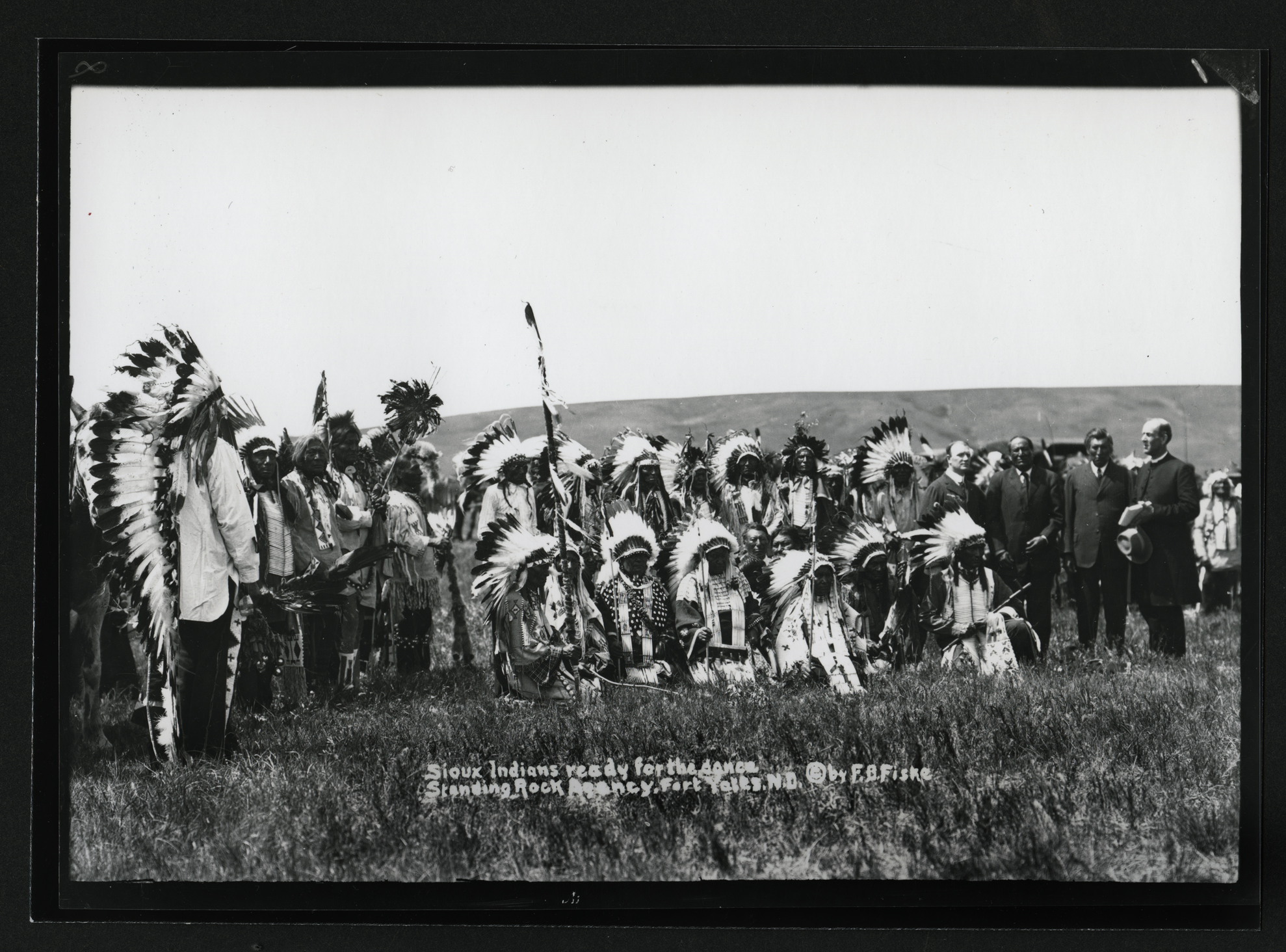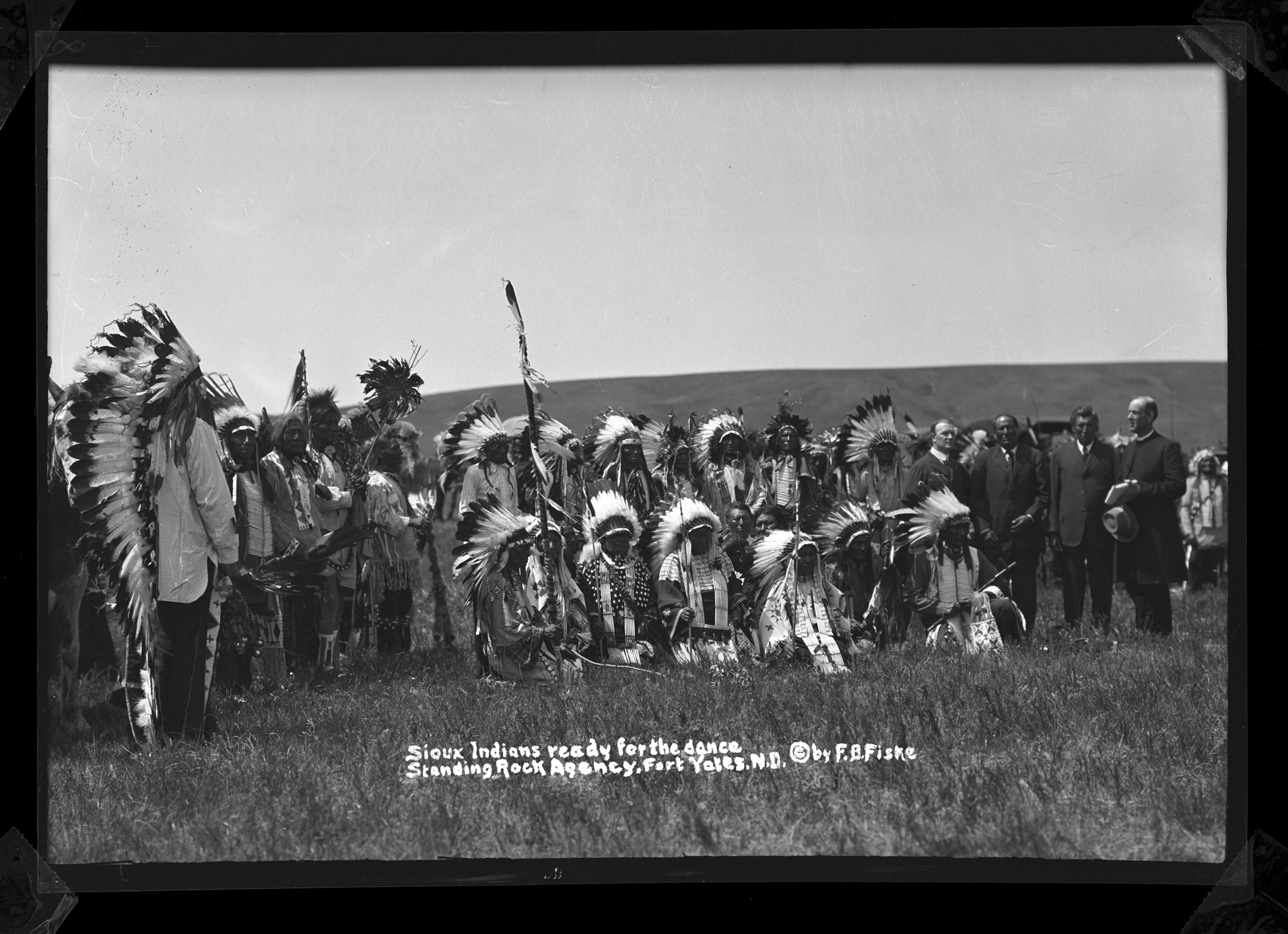 Summary: Includes prints and negatives of portraits, agriculture, education, wildlife, hunting, Frank Fiske studio portraits, and some views of South Dakota. Fiske’s Native American photographs include portraits, Indian gatherings and ceremonies, boarding schools, Indian houses and dwellings, and Native American agriculture. Fiske’s documentation of daily life on the reservation includes such shots as Sioux customers waiting for a Fort Yates trading store to open; a Sioux dance in the streets of Fort Yates; a plow issue before the agency boarding school; an encampment of tipis, including those traditionally painted; and three Indian men being taxied off the reservation to join the army in WWI.