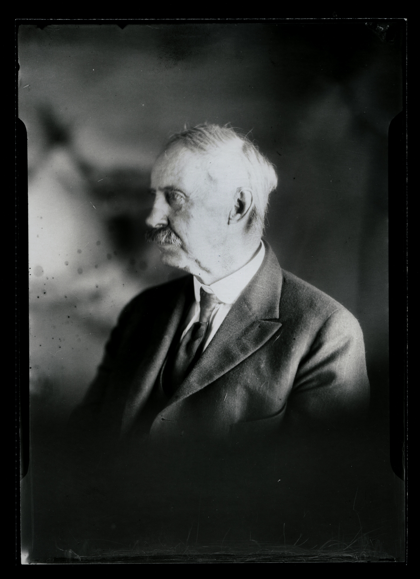 Summary: Side face portrait of John Leach seated wearing a suit and tie