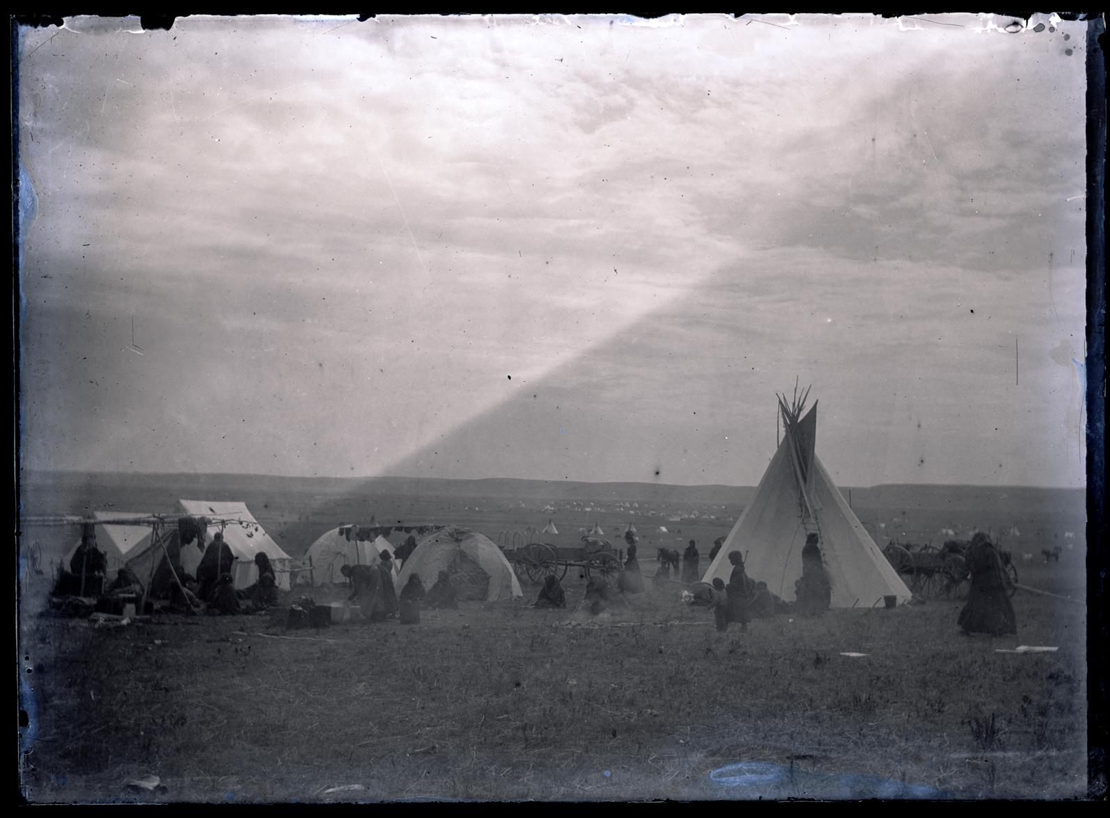 Summary: People stand and sit on the ground among an encampment of tipis and tents. Horses and wagons are also visible in the background