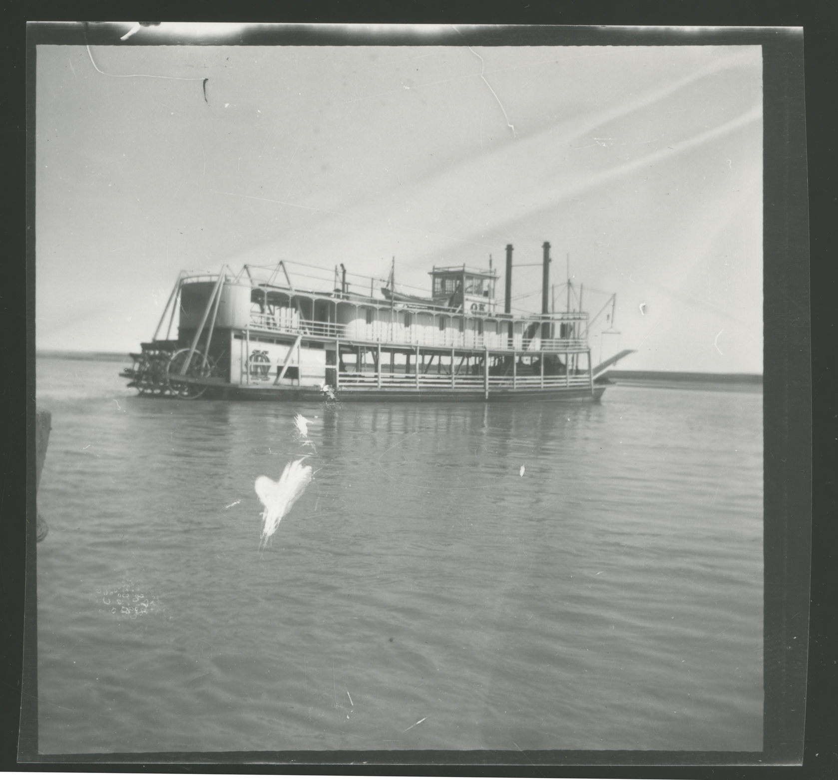 Summary: Starboard view of the steamboat O.K., double-decker paddlewheel boat, on the Missouri River.||The O.K., a sternwheel packet with a wood hull, was built in Cincinnati, Ohio, in 1899, and originally named the Burkesville. Capt. John Marsh, the son of Grant Marsh piloted her for the Charles Stevens Transportation Co. In 1906-1907, she did a thriving business making runs between Milk River and Fort Benton. She burned at Fort Benton on June 30, 1908.